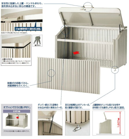 サイズ(mm)幅1800×奥行き800×高さ1045※蓋を閉めた時の高さ仕様上フタ開き・前面パネル開き容量1130L ※45Lゴミ袋:25個相当材質[本体]アルミ押出形材[前面パネル]アルミ 樹脂複合材色ステンカラーお届け期間約1週間 ※在庫有りの場合生産国日本製四国化成工業株式会社製品 ★