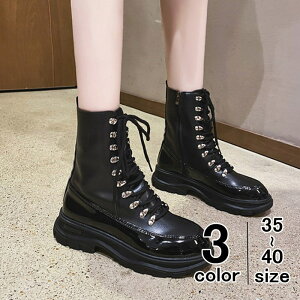 靴 ブーツ 厚底 ぺたんこ レースアップ ミドルブーツ シューズ バイカラー サイドジップ 歩きやすい 美脚 レディース メール便不可おうちコーデ (アパレル)