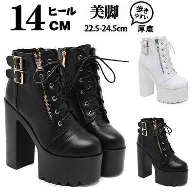 14CM 厚底ショートブーツ 太ヒール レディース ショートブーツ ブーティー ハイヒール レースアップブーツ 編み上げブーツ サイドジッパー 前厚 厚底ブーツ ハイカット ミドルブーツ 袴ブーツ 卒業式 衣装 ブーツ 黒 白