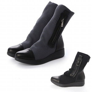 日本製 本革 ミドルブーツ ロングブーツ ローヒール フラット 厚底 ウェッジ 3E 幅広 革 ブーツ レディース 黒 グレー ミドル ロング ニット