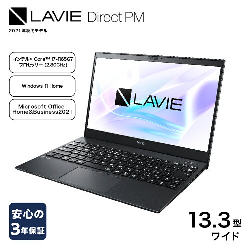 名称パソコン NEC LAVIE Direct PM 13.3型 ワイド ノートパソコン PC ノートPC LED IPS液晶搭載モバイル 2021年秋冬モデル 家電 容量1台 ≪仕様・スペック≫ ●プロセッサー:インテル® Core™ i7-1165G7 プロセッサー (2.80GHz) ●OS:Windows 11 Home ●ディスプレイ:13.3型ワイド LED IPS液晶 (フルHD・1920×1200ドット) ●ボディカラー:ブラック ●ワイヤレス通信:Wi-Fi 6(2.4Gbps)対応 (IEEE802.11ax/ac/a/b/g/n) + Bluetooth® ●メモリ:16GB (オンボード) ●SSD:約512GB SSD ●DVD/CDドライブ:なし ●マウス:なし ●オフィスアプリ:Microsoft Office Home & Business 2021 ●リチウムイオンバッテリ(L) ●保証:あんしん保証サービスパック 3年版 発送期日入金確認後、1~2か月程度 ただし、申込状況や部材調達状況(新型コロナウイルスの影響等)によっては配送が遅れる場合がございます。