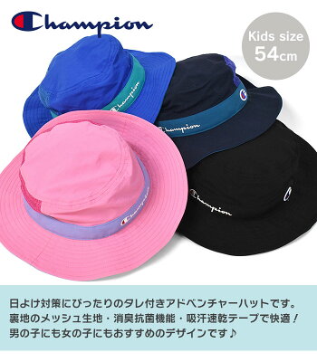 Champion チャンピオン ハット キッズ 女の子 男の子 帽子/ タレ付き アドベンチャーハット /子供 子ども キッズサイズ サファリハット 紐 紐付き 紫外線対策 首 軽い 軽量 かっこいい かわいい 可愛い おしゃれ シンプル 無地 夏 公園 54cm ロゴ 刺繍 ブランド ナイロン/