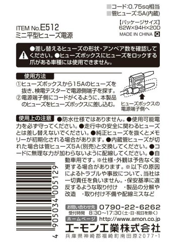 エーモン【E512】ミニ平型ヒューズ電源 商品説明 ■ポータブルナビ・レーダー探知機・ドライブレコーダーなどの電源取り出しに ■ヒューズボックスのミニ平型ヒューズと差しかえるだけで電源が簡単に取り出せる 【仕様】 ・15Aヒューズから5Aの電源が取れる ・付属コード:AVSS0.75sq ・15Aヒューズ交換用 ・使用可能電力:DC12V60W以下/DC24V120W以下 ・内蔵管ヒューズ:5A 【内容物】 ・ミニ平型ヒューズ電源(15A):1個 製品コードE512 製品名ミニ平型ヒューズ電源 JANコード4905034005129 ※掲載商品の仕様、デザイン、生産国、発売時期は 予告なく 変更する場合がありますので、 あらかじめご了承ください。